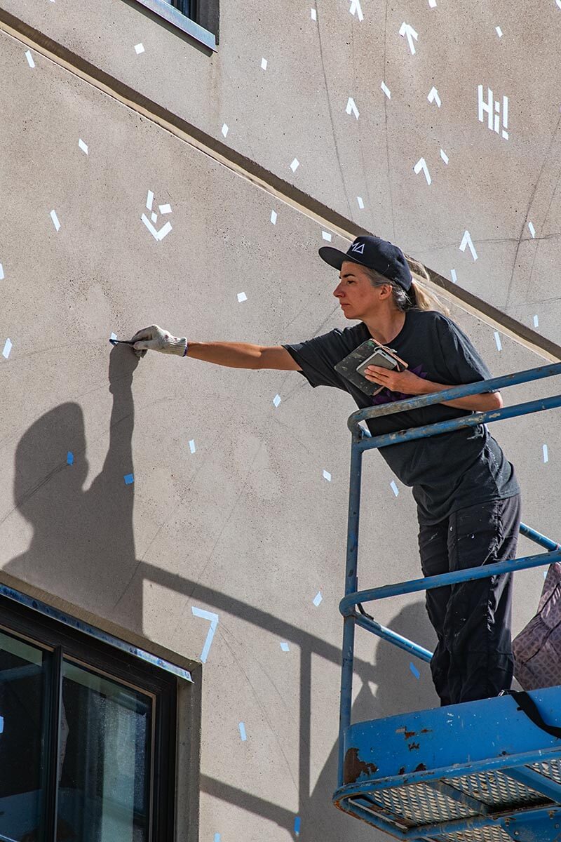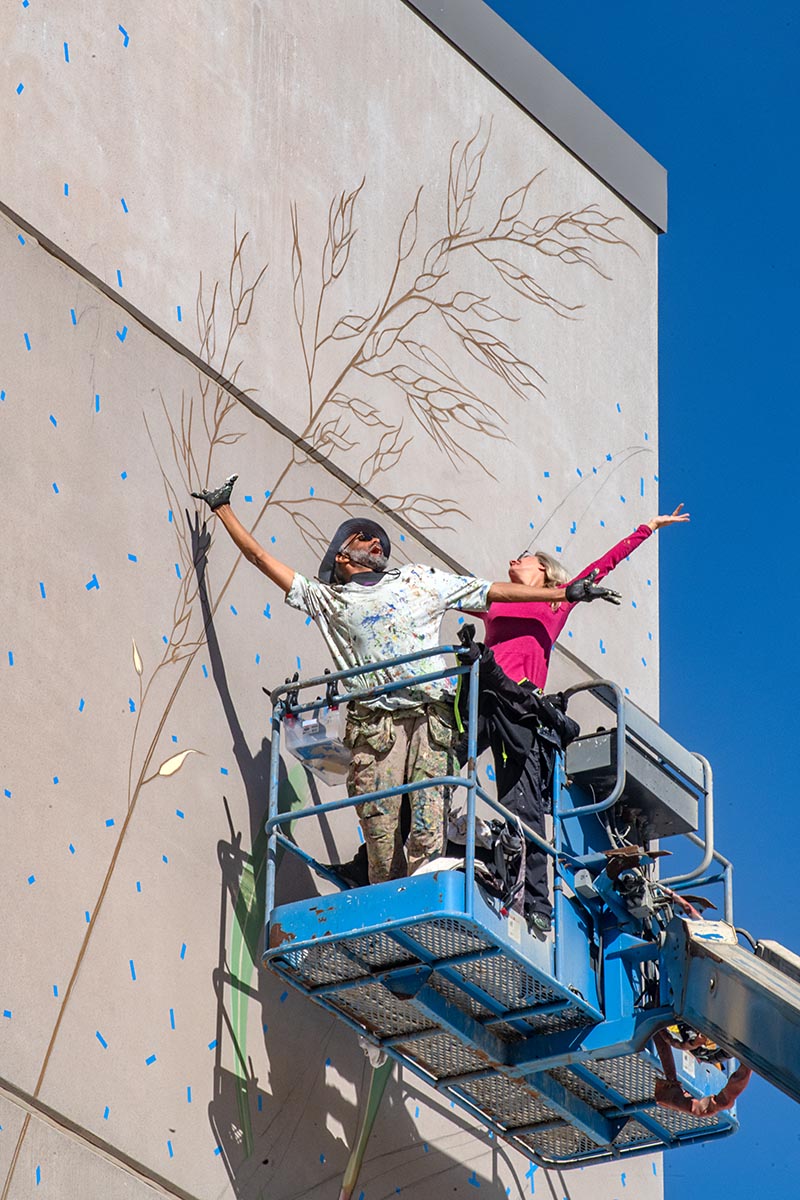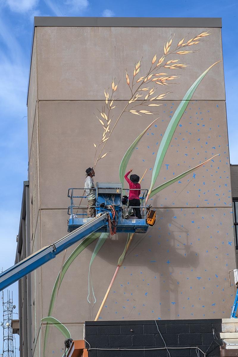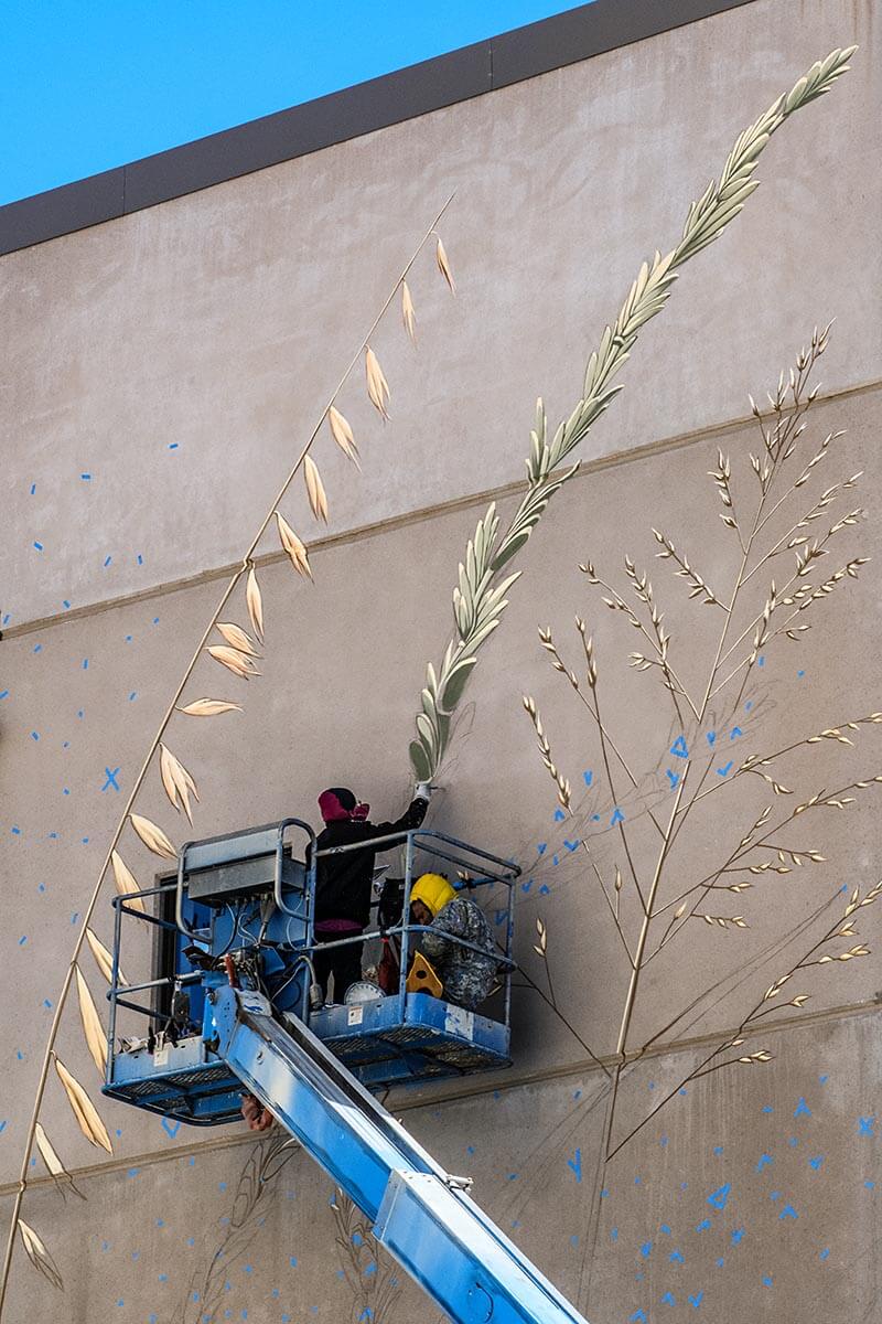 Mona Caron, a Swiss-born, San Francisco-based artist, uses muralism, illustration, and photography in both her art and artivism. Her focus is on community-informed and site-specific murals in public spaces. She has created large-scale murals in the US, Europe, South America, and Asia has delved into stop-motion animation as part of her "WEEDS" project, and co-creates visuals for street actions and outreach with social and environmental movements. In cooperation with The Land Institute (https://landinstitute.org/)