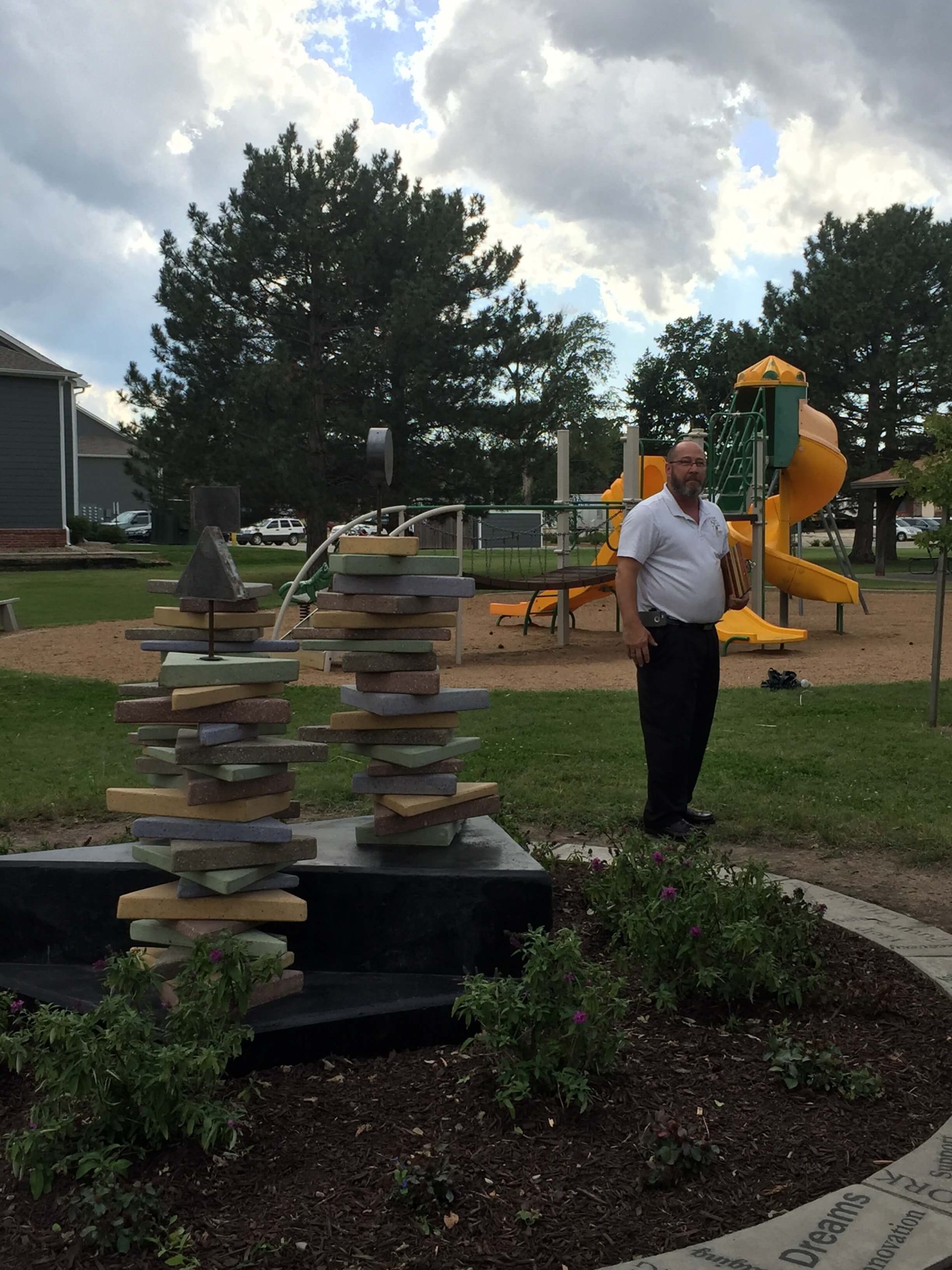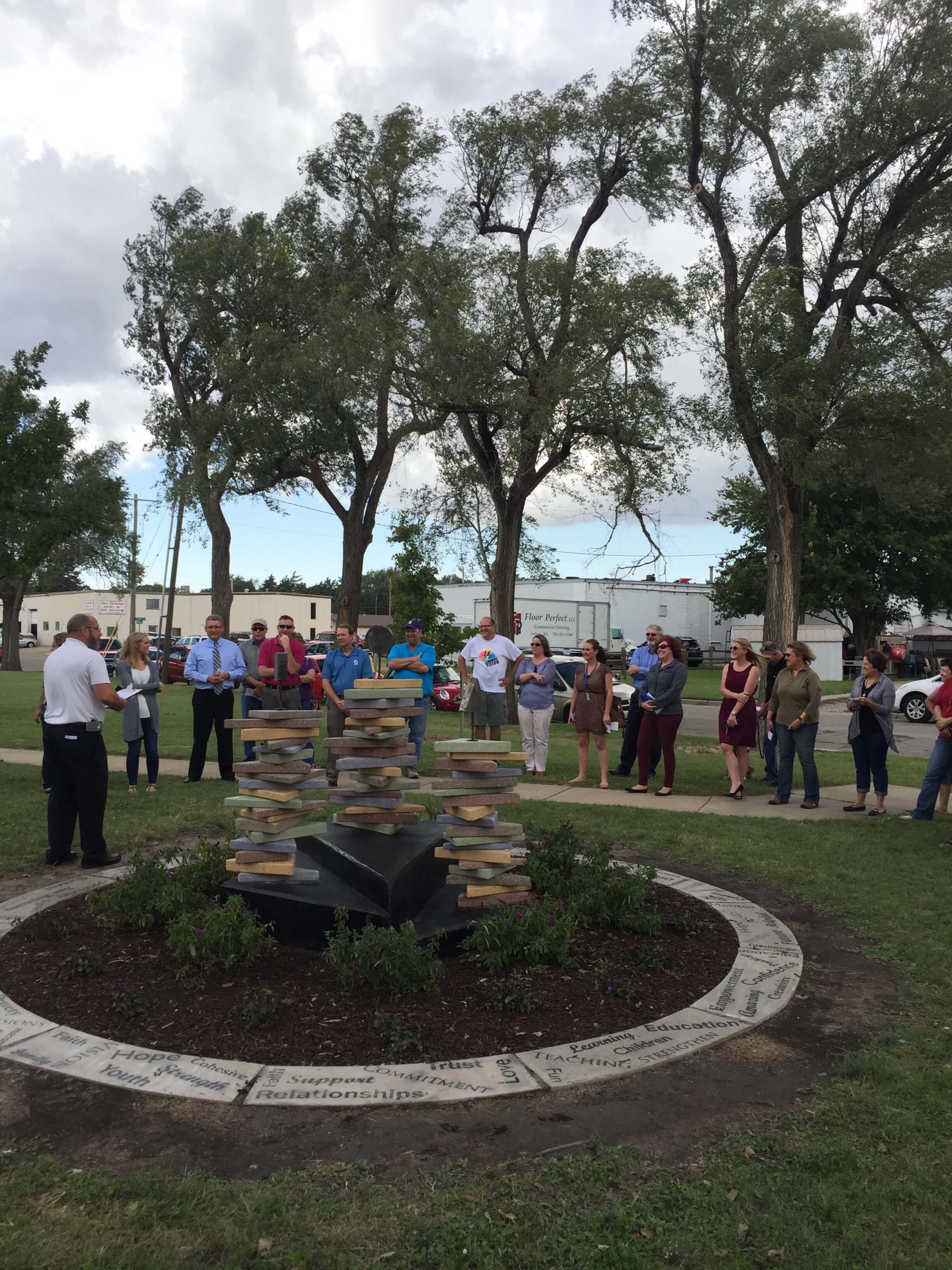 Each triangle in the sculpture represents an individual from one of five partnering organizations that have been influential in North Salina. Volunteers from Big Brothers Big Sisters, DVACK, Ashby House, The City Teen Center, and St Johns Missionary Baptist Church all created individual triangles for this project. In addition to the vertical elements, the surrounding ring includes words collected from the five organizations that help describe their mission and its effect on those they serve This project was brought to Hawthorne Park by North Salina Community Development Group, Earl Bane Foundation, Advantage Trust, OPI, Hi-Co Motors, Salina Arts & Humanities, Prairie Land Foods, Soggy Dog, J Vosseller, Randy's Auto, and Realtec.