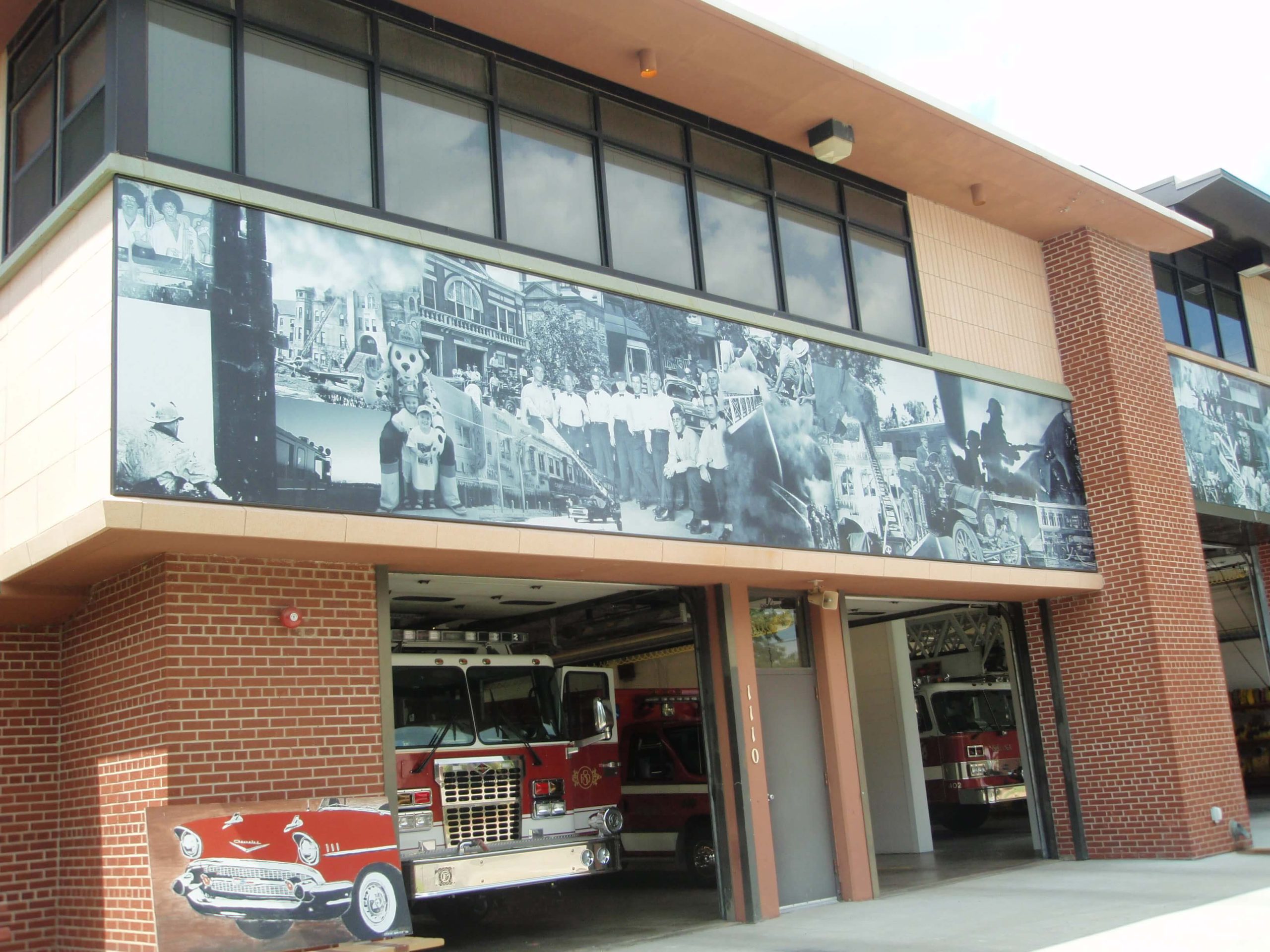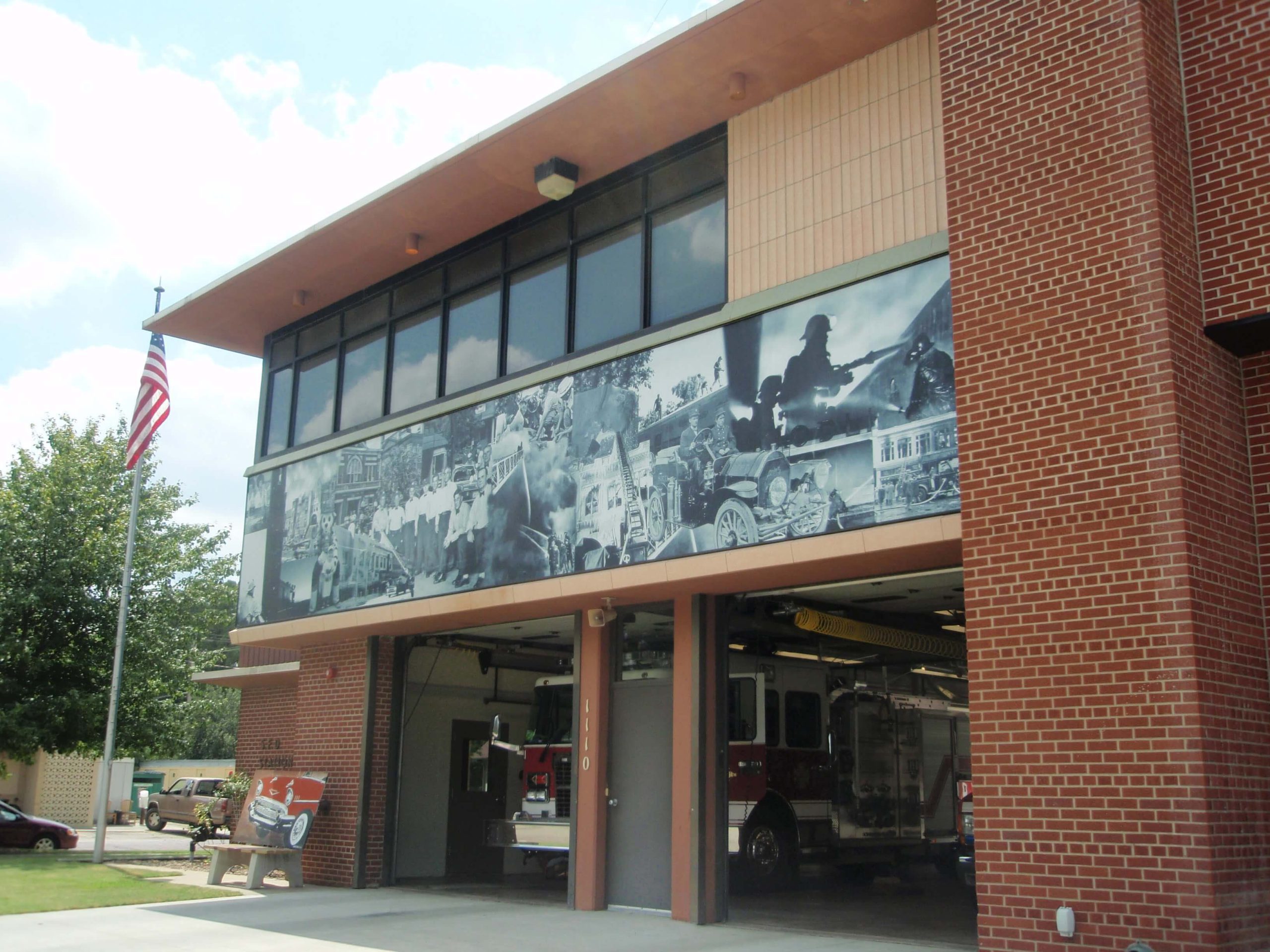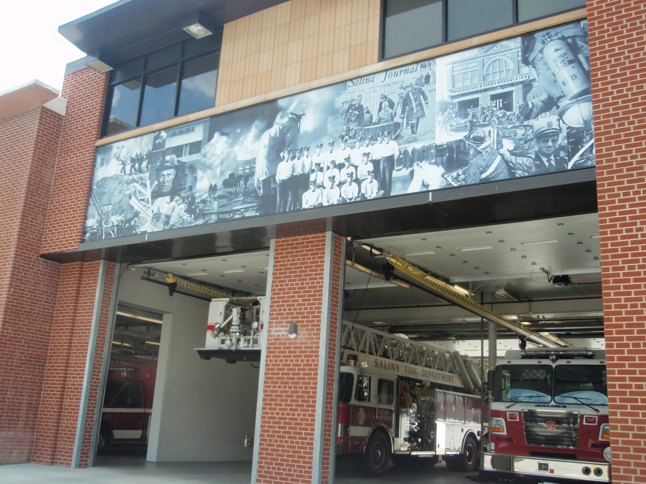 The mural is part of the architectural renovation of the fire station designed by Salina architect, Warren Ediger. The mural features celebrated photographs of dedicated firefighters, bringing the history and stories of firefighting in our community to life. Housed on the exterior of the fire station, the mural honors the service and allegiance of those firefighters who diligently serve Salina. Krob’s design for the mural was selected from various submissions solicited by Ediger during the fire station renovation process.
