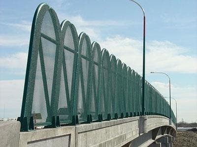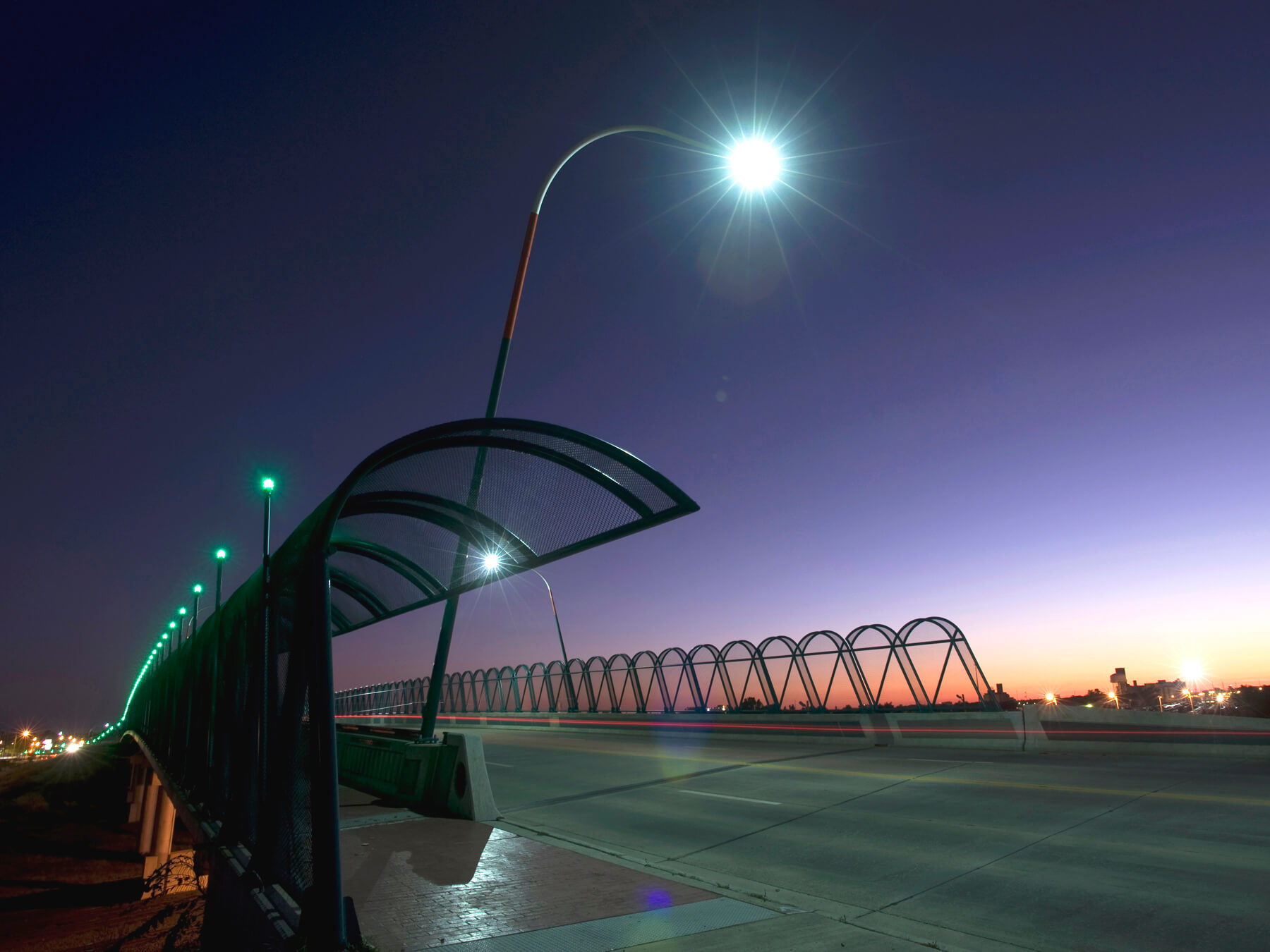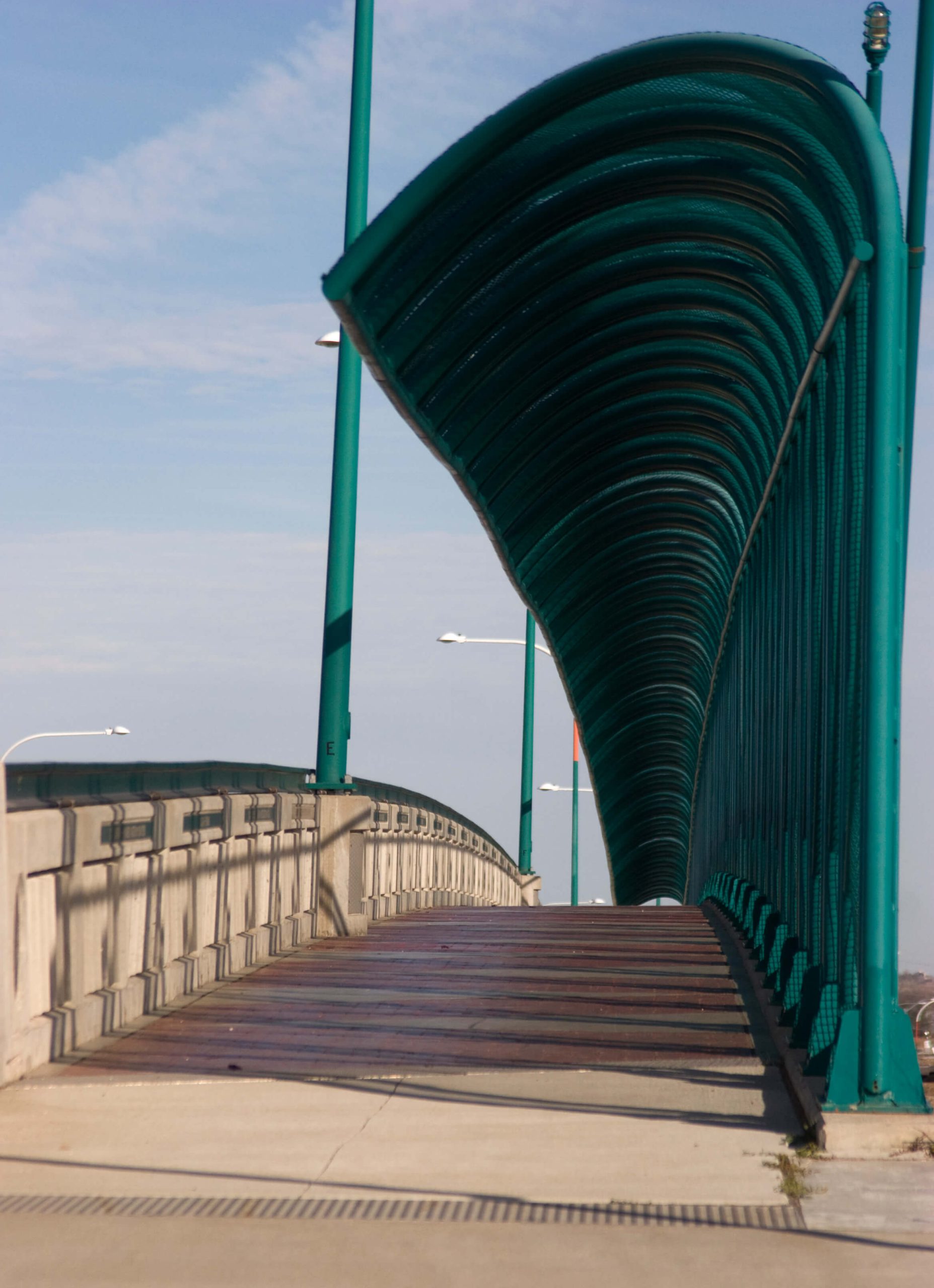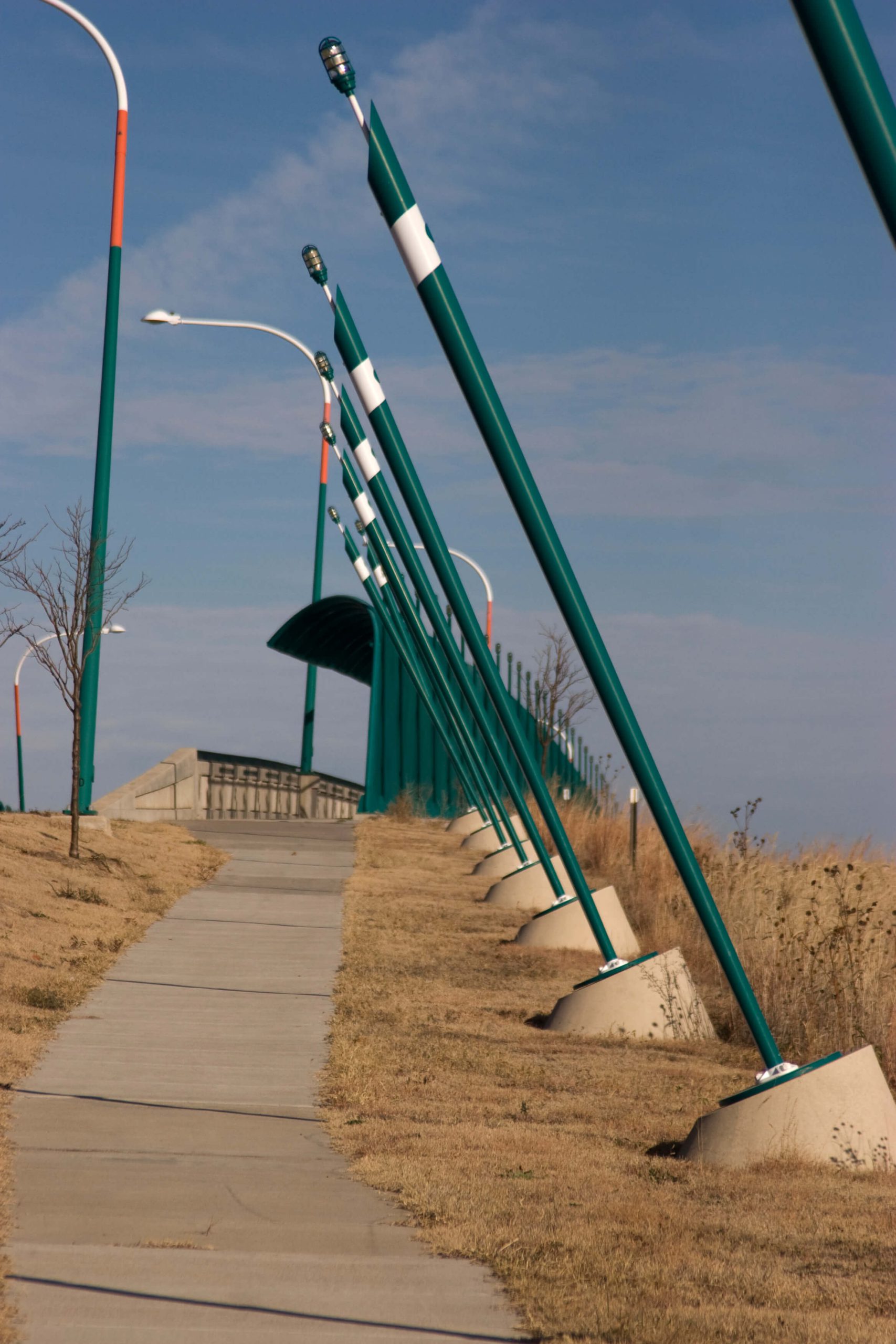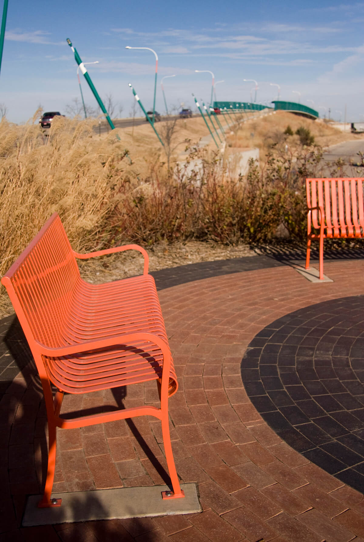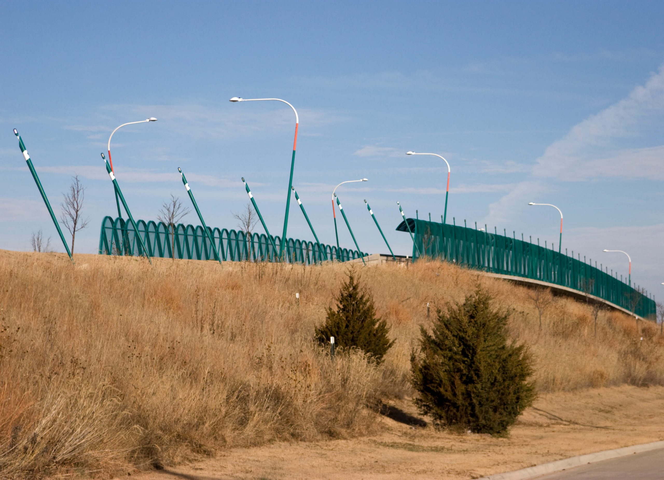 Salina’s Ohio Street entryway brought together a design team of engineers and architects, bridge builders, landscape designers, and artist Vicki Scuri. Together the team worked with the City and Union Pacific Railroad to create a much-desired vehicle and pedestrian overpass. The organizing principle in this gateway design is Salina’s railroad history. Design elements in the required fencing, pedestrian path, bridge structure, lighting, and landscaping all relate to railroads and the cadence of trains, providing a rhythmic progression of experiences as one enters or departs Salina. Names of local trains that operated on the tracks below are integrated into the protective barrier wall.