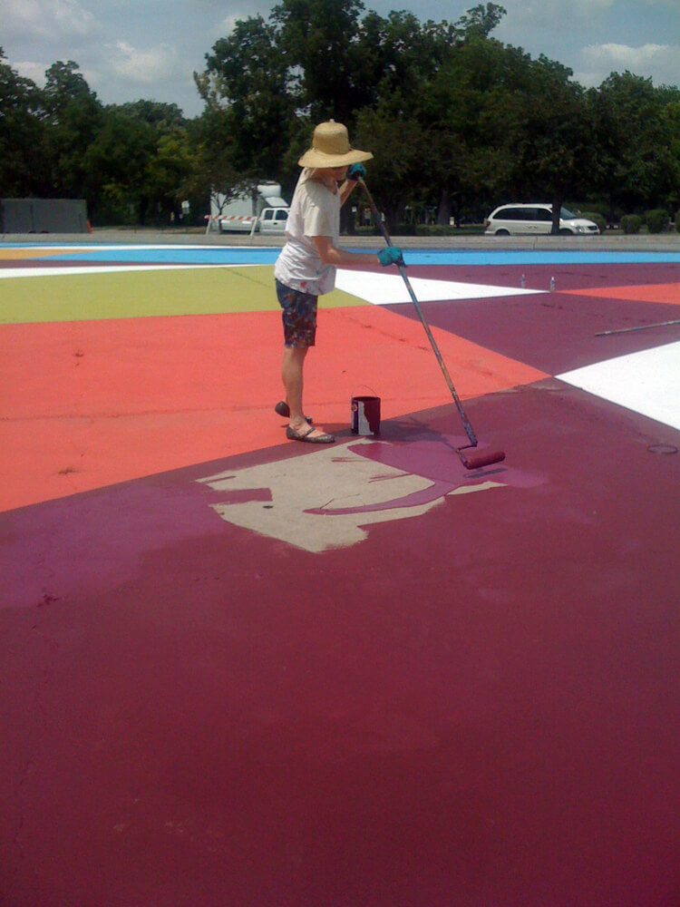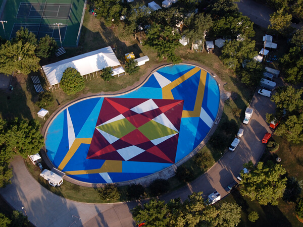 Combining traditional European and Afro- Caribbean patterns, Brooklyn-based artist Molly Dilworth builds her projects from the ground up, literally and metaphorically. The work is a horizontal mural that integrates the history of Salina's favorite summer-fun activity - swimming. Built in the 1920s, the large pool, now a shallow pond, is painted with two derivative patterns - Pennsylvania Dutch barn decorations and English-Irish quilt patterns. The inset design demarcates the size of the Carver Pool -40 by 60- which opened in 1948 as a blacks-only pool during Salinas segregation days. This work is visible to satellite engines such as Google Earth, marking a visual history of Salina from an aerial perspective. A project of the Smoky Hill River Festival.