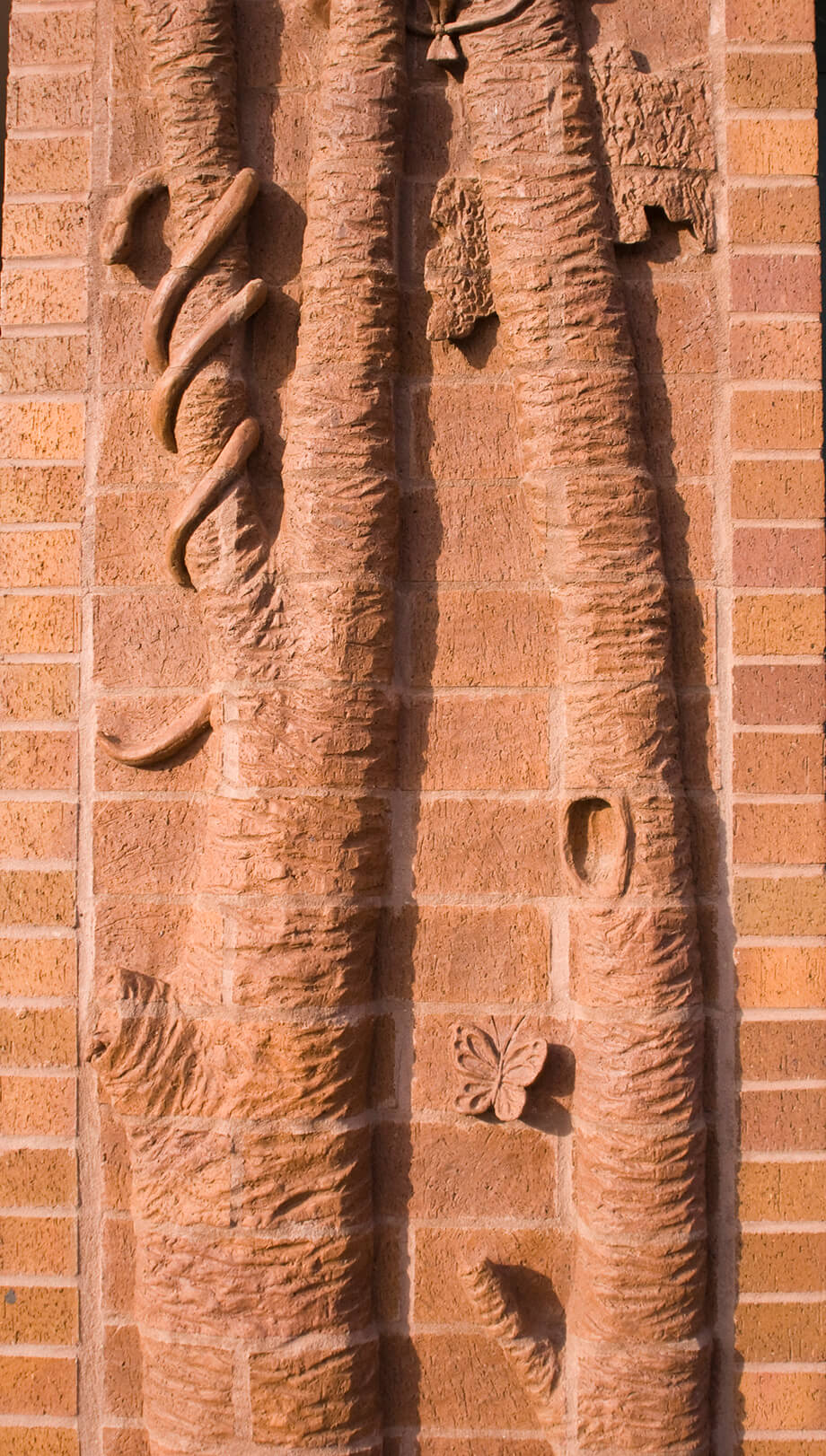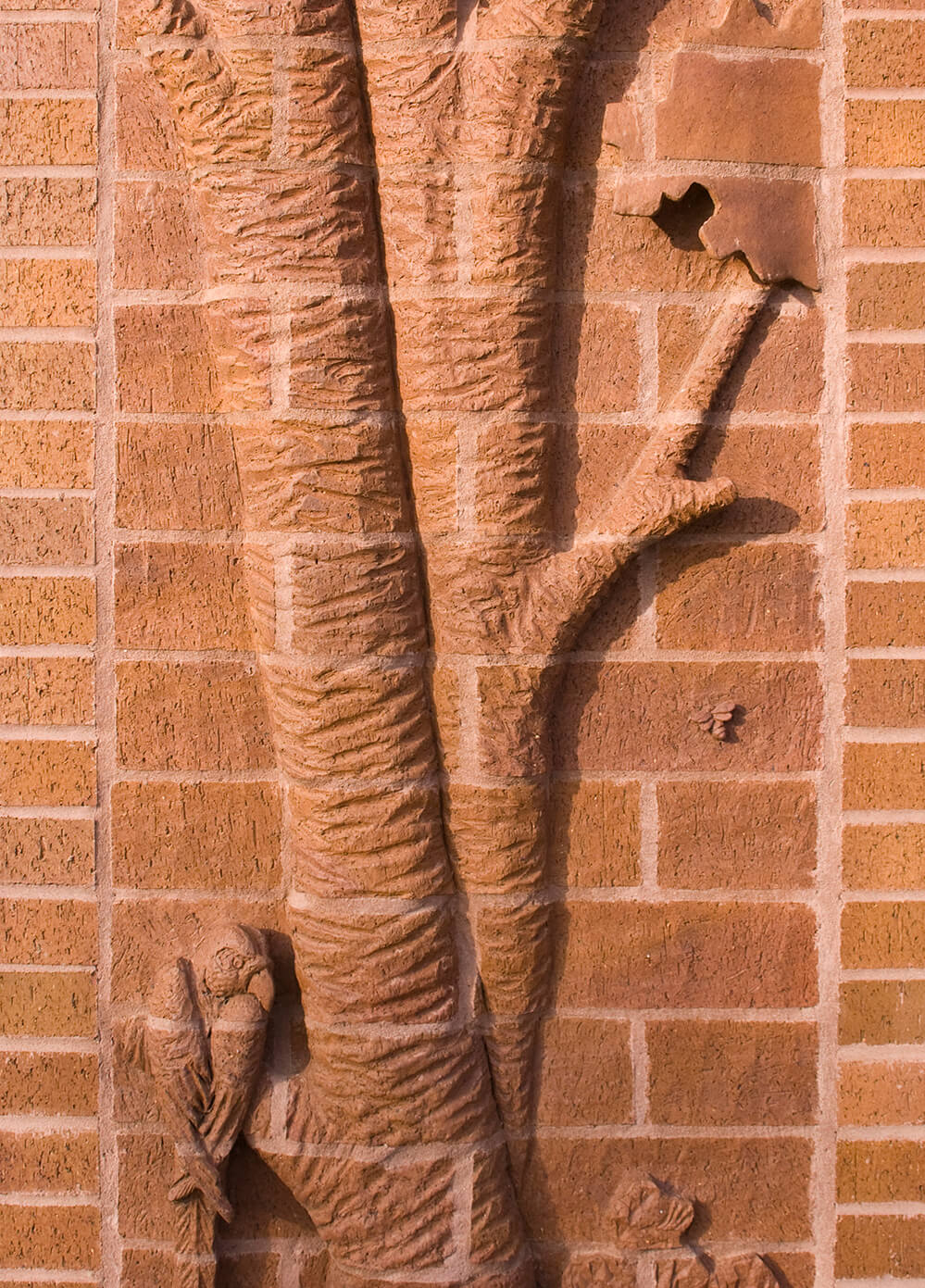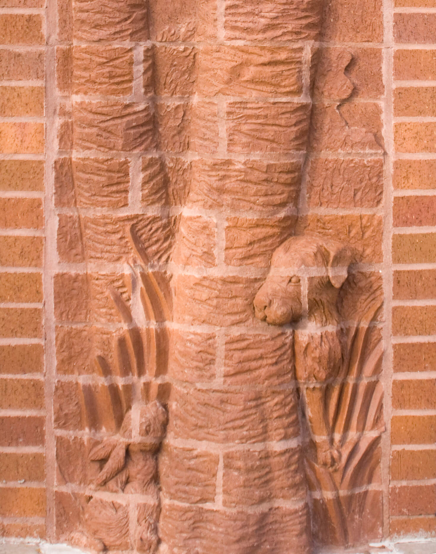 As you approach the entrance to the Animal Shelter, discover the many creatures sheltered within the carved brick trees. Under a Canopy of Hope describes the important work of this facility & providing a safe haven for animals, a place to adopt a pet, learn about their care, exercise your dog, purchase a tag, or deal with the harder aspects of parting with a beloved companion. The artist's work truly provides a visual parallel with shelter in the natural world. It is a tribute to the work of this very important place.