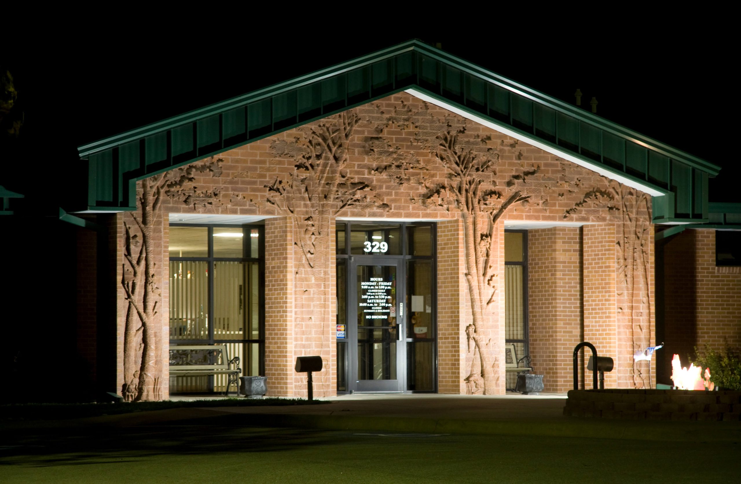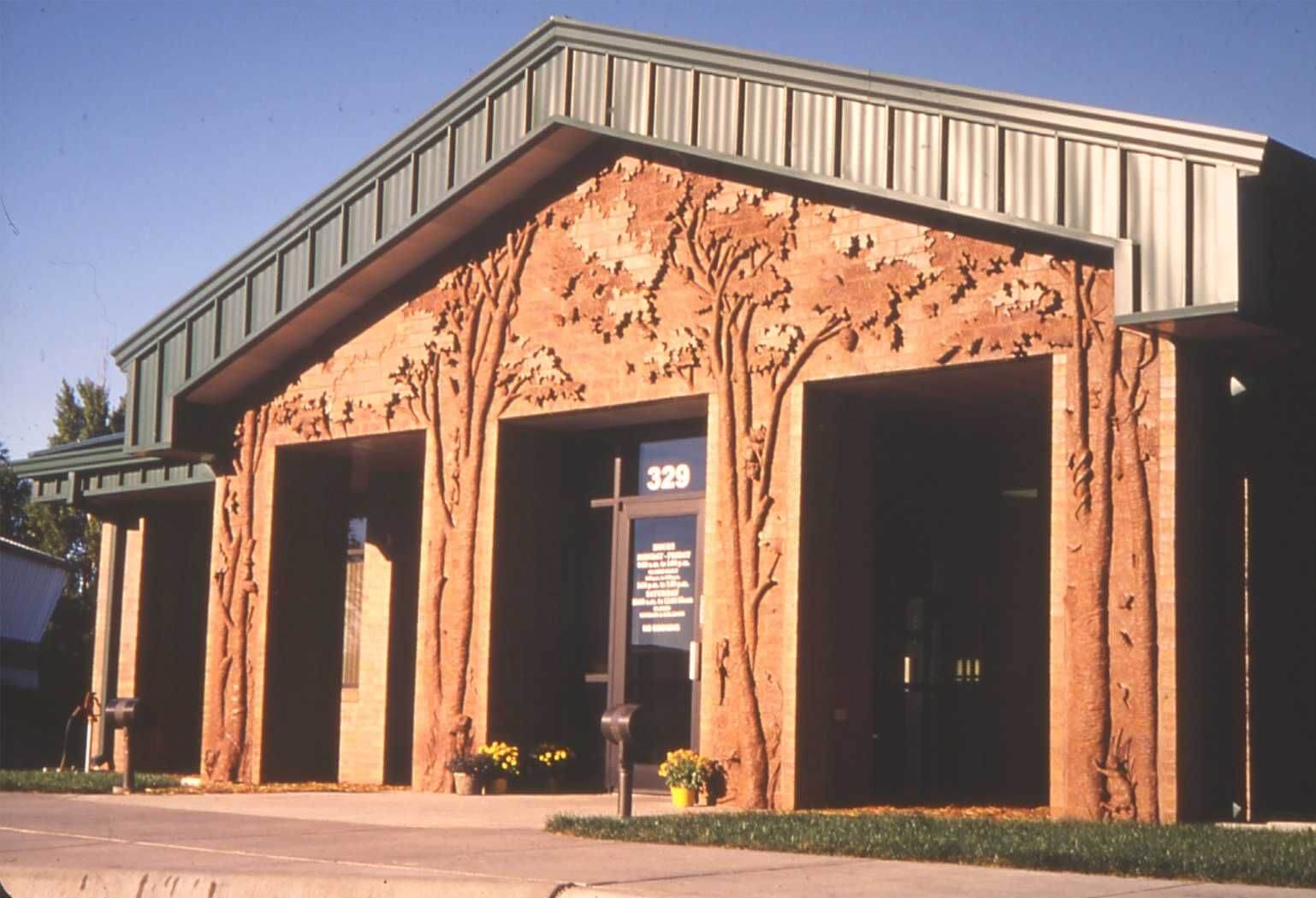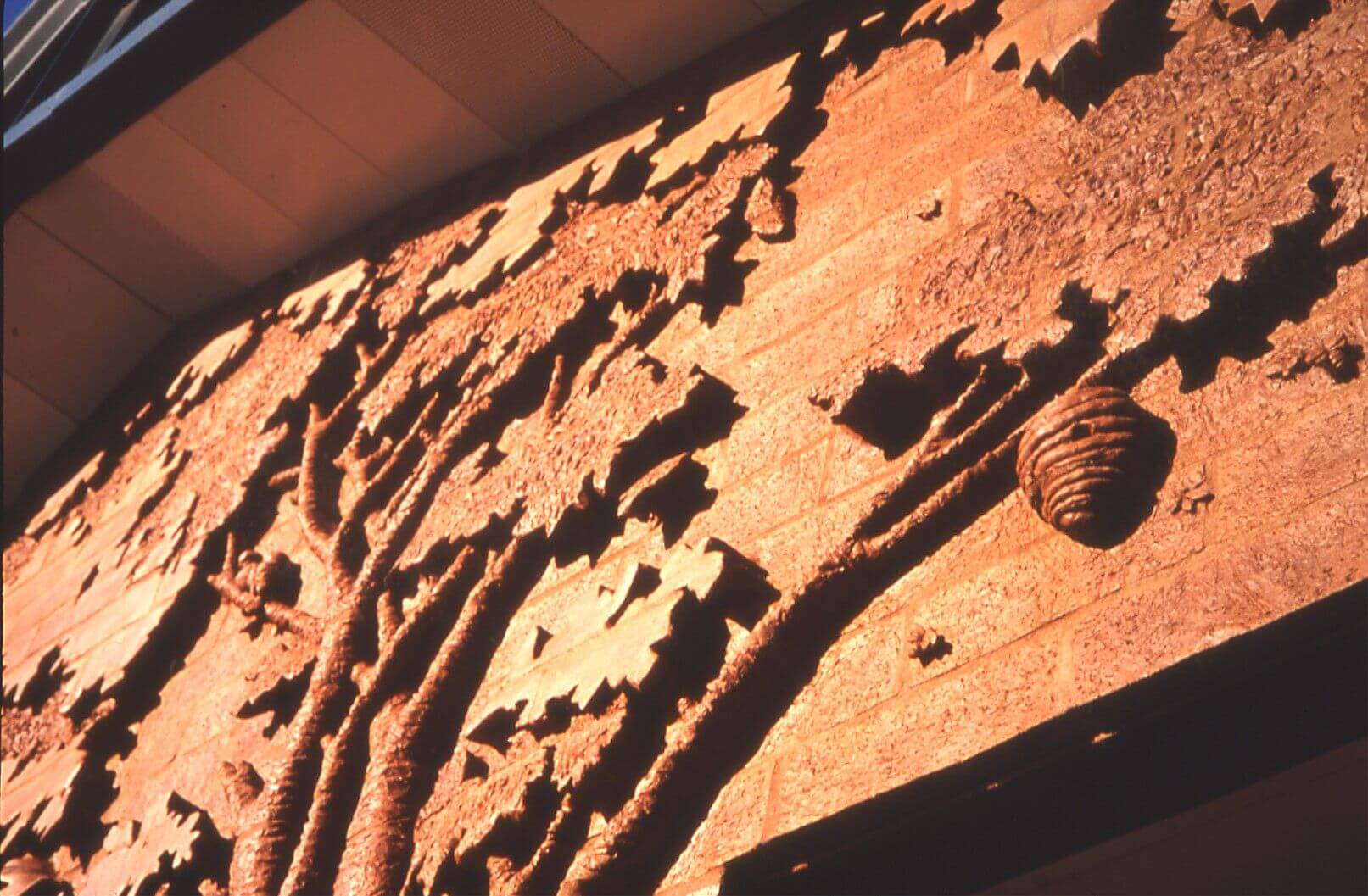 As you approach the entrance to the Animal Shelter, discover the many creatures sheltered within the carved brick trees. Under a Canopy of Hope describes the important work of this facility & providing a safe haven for animals, a place to adopt a pet, learn about their care, exercise your dog, purchase a tag, or deal with the harder aspects of parting with a beloved companion. The artist's work truly provides a visual parallel with shelter in the natural world. It is a tribute to the work of this very important place.