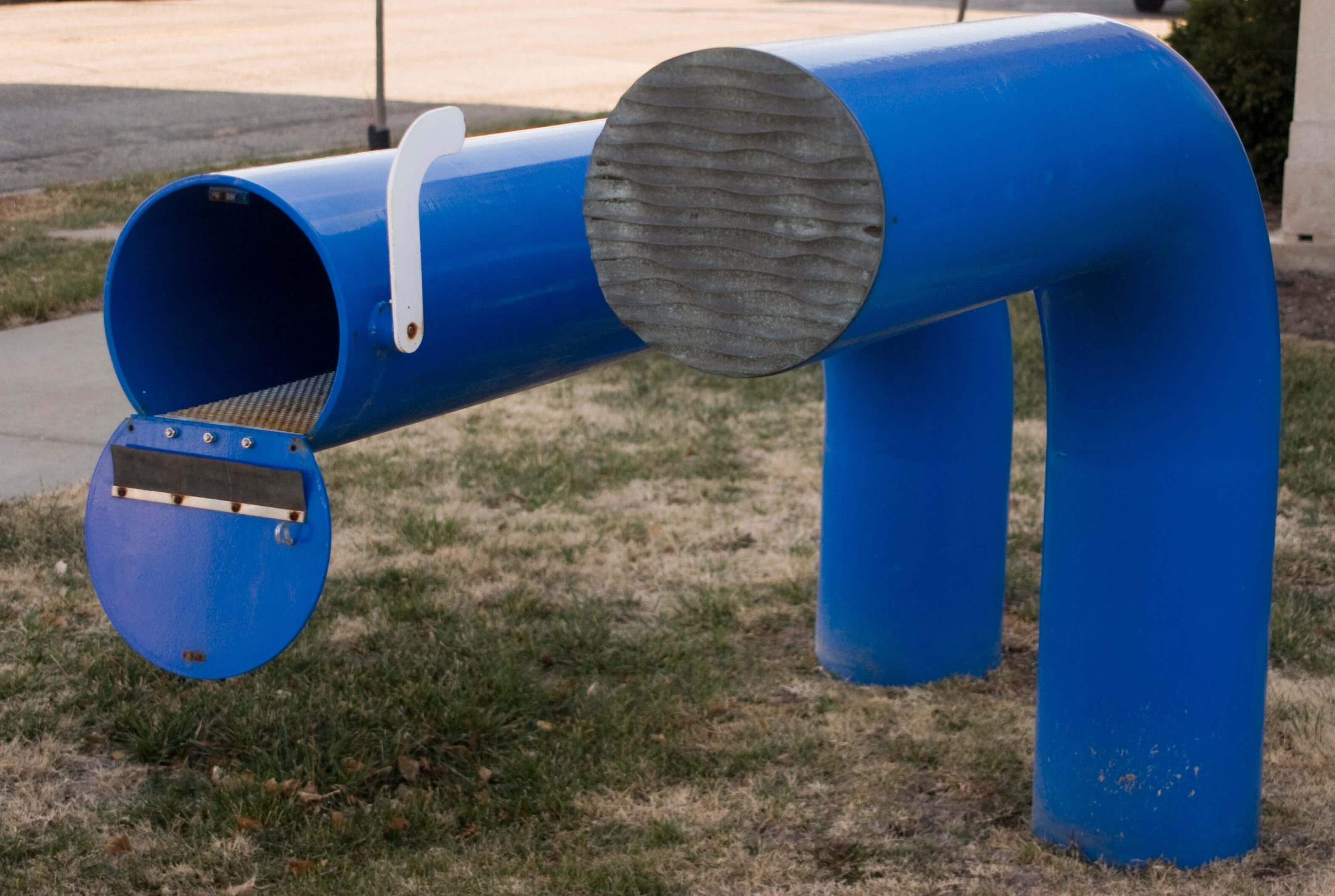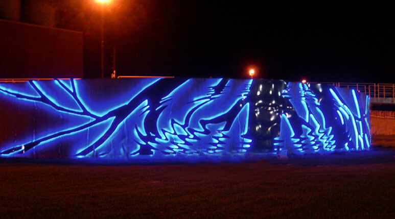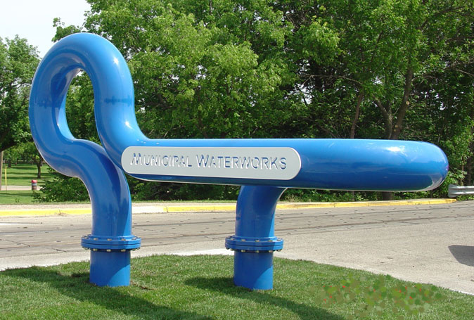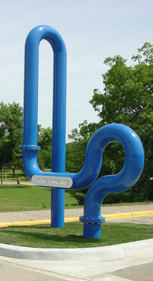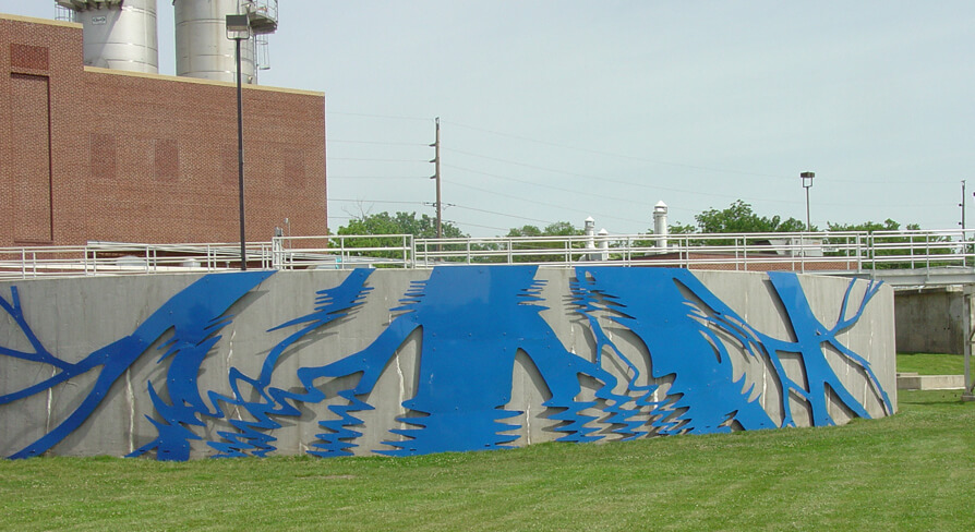 Function and aesthetics are addressed in the multi-faceted sculptural installations throughout the renovated plant campus, telling the story of how Salinas’s water is made safe to use and drink every day. Storage tank relief designs provide a bold and night-lit reference to nature’s methods of moving water through root systems, while tubular pipe sculptures depict manufactured networks that carry water above and below ground. These large-scale blue metalwork also offer creative solutions to the street closure, plant entrance designation, protective traffic bollards, a water-sample-size mailbox, and a historical listing of the streams, creeks, and rivers that supply water to the Salina community. Artists often provide design consulting and creative fabrication skills to community art and design projects. In some cases, artwork is designed to provide functional and decorative solutions. Salina’s Water Treatment Plant is unusual in its center-of-the-city location. Located between the large medical complex and historic Oakdale Park, the artist elected to honor the beautiful art deco of the original architecture as well as the function of the plant itself. The oldest structure on the campus has become a state-of-the-art administration building. Water storage, movement, and distribution became the focus for creative reference, while roots and pipes became the natural and manufactured symbols for the services provided by this essential City Department. Pipe sculptures serve as barricades, a mailbox large enough for water samples, street closing solutions that serve as entrance signage, and a display of the names of inlets that feed Salina’s water supply. Decorative relief sculptures depicting natural root systems adorn the concrete water basins and are dramatically backlit at night. Historic sensitivity, adaptive reuse, and physical enhancements honor the legacy of providing clean water to Salina. Artist’s Statement: “In the numerous buildings of the Salina Municipal Water Plant, people and processes are happening 24 hours a day, every day of the year, to provide the people of this city with water. Most amazingly, is what is not seen…3,000,000 gallons of water exist in vast underground chambers…water that has been made safe for you to use and drink every day.”